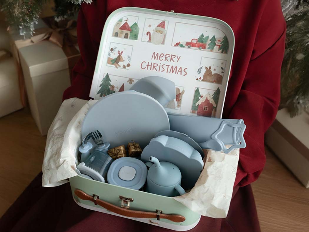 Moonkie's First Bites Gift Set is a chic all-in-one feeding solution for your little learner.A thoughtful gift for baby’s first Christmas, creating heartwarming mealtime moments touched with soft winter hues and festive cheer.