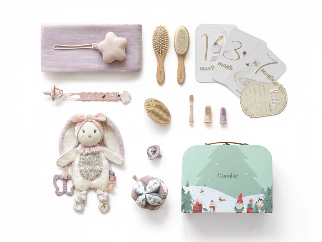 The Moonkie Newborn Set celebrates every first holiday moment—from soft swaddles for cozy festive naps to soothing loveys and pacifiers, gentle brushes for daily care, and milestone cards to capture each tiny smile.