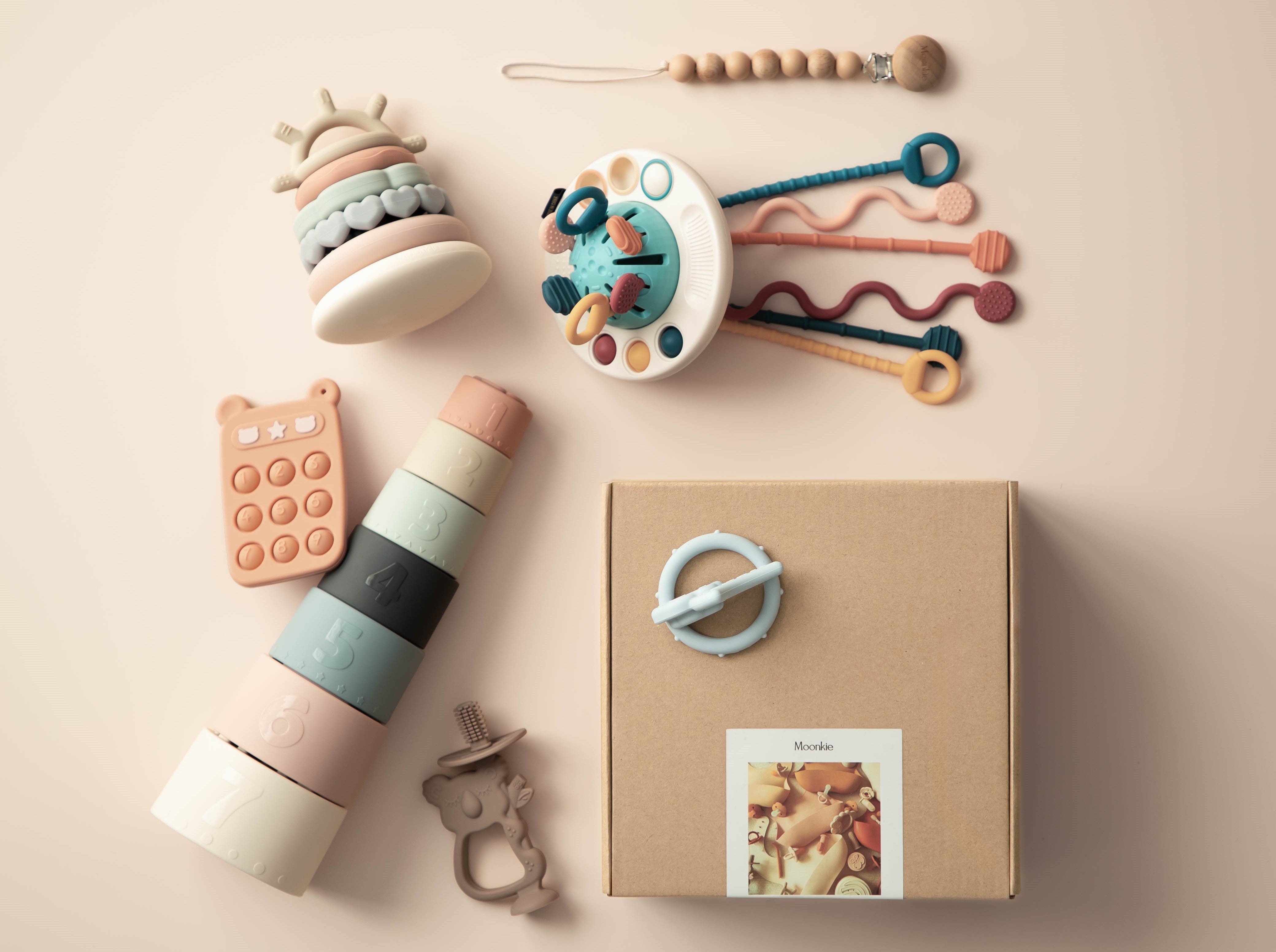 Moonkie’s Montessori-inspired sets are a gift-giver’s delight, seamlessly combining style, function, and personalization. Crafted from food-grade silicone, they’re safe and perfect for playtime. Add a personal touch with baby’s name or upgrade to a luxe box for a truly memorable gift.